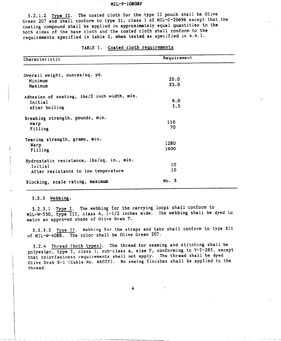 Page Title: Table I. Coated Cloth Requirements Back | Up | Next